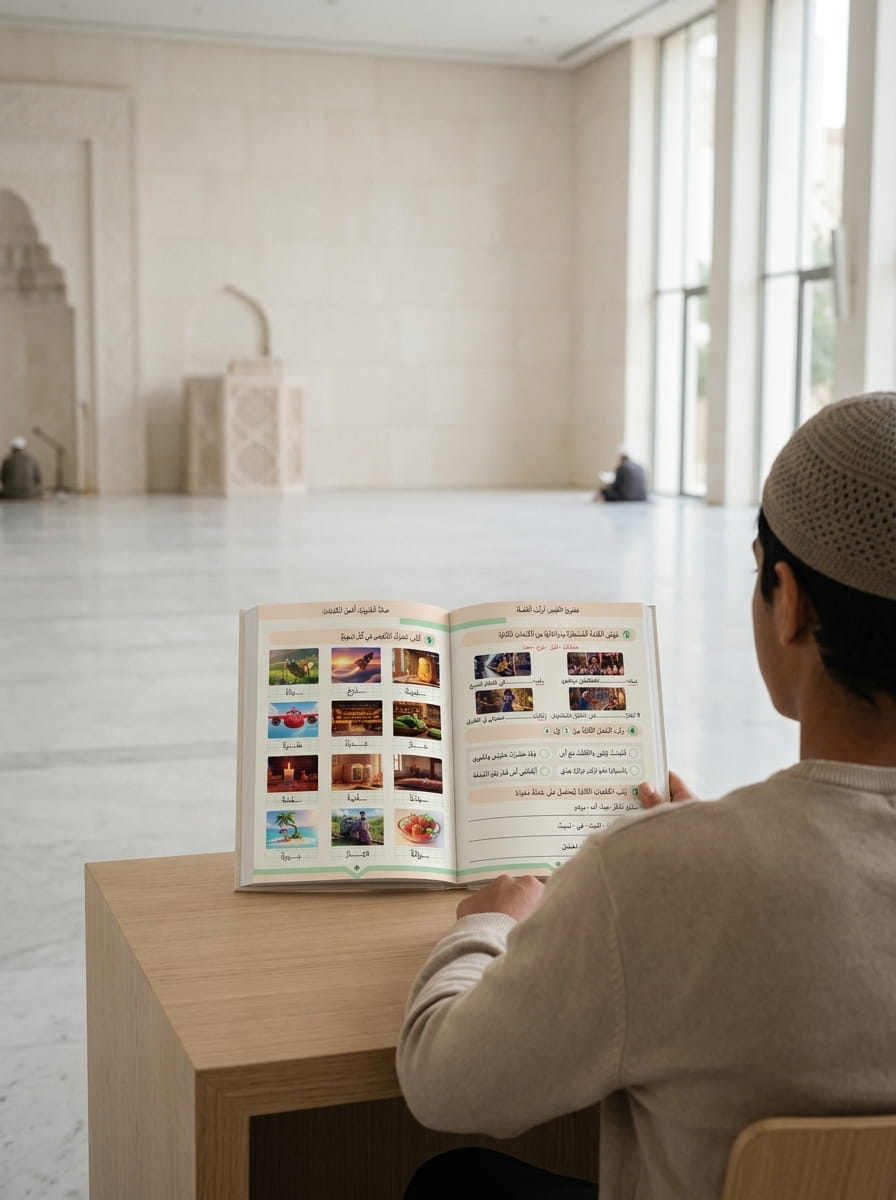 AUTONOMIE ET MAƎTRISE DE L'EXPRESSION Le Livre 1 suit une logique de prĆ©cision : aprĆØs avoir consolidĆ© l’orthographe, l’élĆØve entre dans la grammaire active. Chaque leƧon est conƧue pour que l'enfant puisse immĆ©diatement rĆ©utiliser les structures apprises dans des thĆØmes familiers comme la nature, la famille ou la vie Ć  la mosquĆ©e. NIVEAU 4 Rendre la langue VIVANTE Le Niveau 4 est conƧu pour transformer les acquis fondamentaux en une vĆ©ritable compĆ©tence de communication. ƀ ce stade, l’élĆØve ne se contente plus de lire ; il commence Ć  structurer sa pensĆ©e en arabe. Deux livres complĆ©mentaires guident cette progression : le Livre 1 pose les bases de la syntaxe et de la conjugaison, tandis que le Livre 2 dĆ©veloppe l’analyse textuelle et la capacitĆ© Ć  rĆ©diger des rĆ©cits cohĆ©rents. Le Niveau 4 est conƧu pour transformer les acquis fondamentaux en une vĆ©ritable compĆ©tence de communication. ƀ ce stade, l’élĆØve ne se contente plus de lire ; il commence Ć  structurer sa pensĆ©e en arabe. Deux livres complĆ©mentaires guident cette progression : le Livre 1 pose les bases de la syntaxe et de la conjugaison, tandis que le Livre 2 dĆ©veloppe l’analyse textuelle et la capacitĆ© Ć  rĆ©diger des rĆ©cits cohĆ©rents. Ce niveau s'adresse aux Ć©lĆØves ayant dĆ©jĆ  acquis une lecture fluide et souhaitant s’initier aux mĆ©canismes de la langue : construction de phrases, emploi des temps et enrichissement du vocabulaire. Il est idĆ©al pour les classes de mosquĆ©es cherchant Ć  professionnaliser leur enseignement avec un programme clĆ© en main qui assure la transition entre le dĆ©chiffrage et la comprĆ©hension rĆ©elle des textes. Le Livre 1 pose les bases linguistiques (syntaxe, passĆ© Al-Madhi et phonĆ©tique), tandis que le Livre 2 se consacre Ć  l'analyse de textes et au lexique religieux.